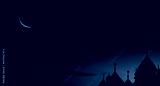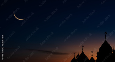 Silhouette dome mosques and crescent moon on dusk sky twilight after sundown, Religion of Islamic