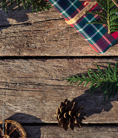 Christmas concept frame with tartan pattern gift box on the old weathered wooden table. Winter holiday vintage greeting card. Copy space