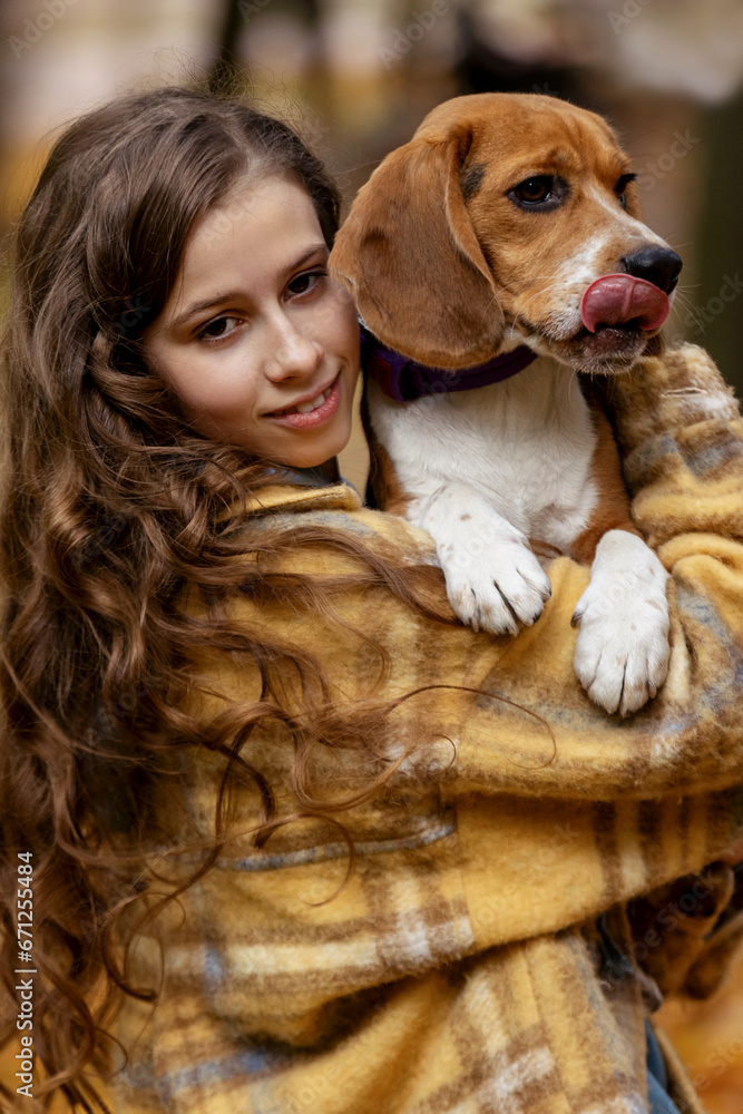 A cute girl holds a dog in her arms. Beagle dog. Close-up
