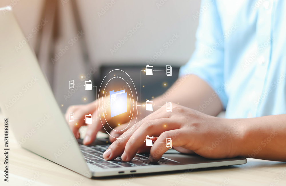 Businessman working on a laptop computer document, manage, file, data, folder, share, digital, information, Electronic document management online document database paperless office concept