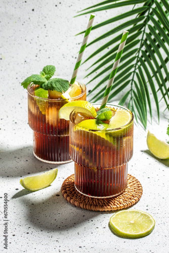 Cold alcohol drink with rum, cola, mint and lime in the glass Cuba Libre. top view. place for text