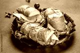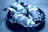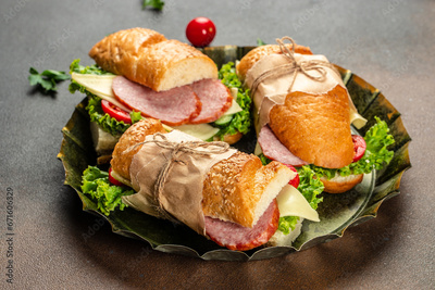 Fresh baguette sandwich with bacon, cheddar cheese, lettuce and vegetables on a dark background. top view. copy space for text