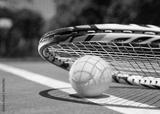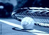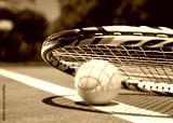 Close up view of tennis racket and balls on tennis court