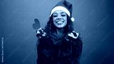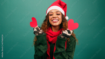 Cute young multi-ethnic woman plays with heart shapes, Christmas studio