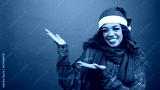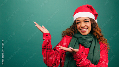 Beautiful young woman gestures palms to copy space, Santa hat studio