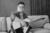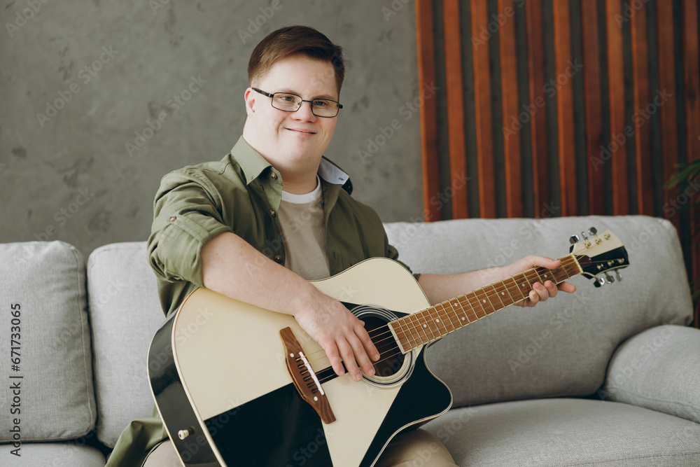 Young fun man with down syndrome wear glasses casual clothes play guitar look camera sits on grey sofa couch stay at home flat rest spend free time in living room. Genetic disease world day concept.