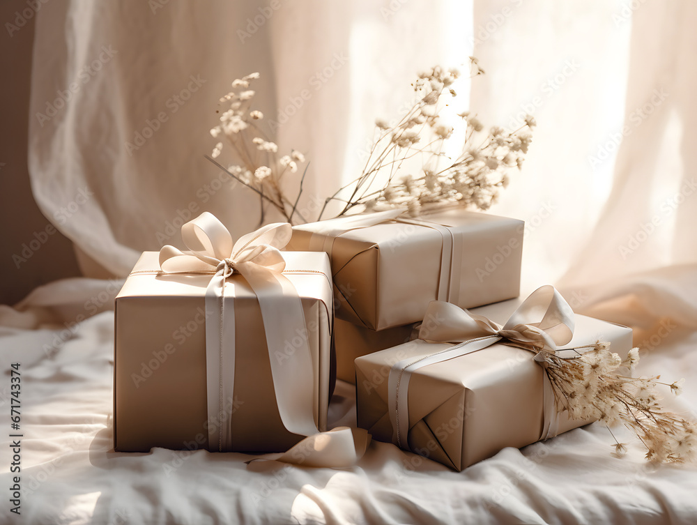 Natural beige gift boxes wrapped in brown paper and ribbons with flowers and natural sunlight