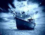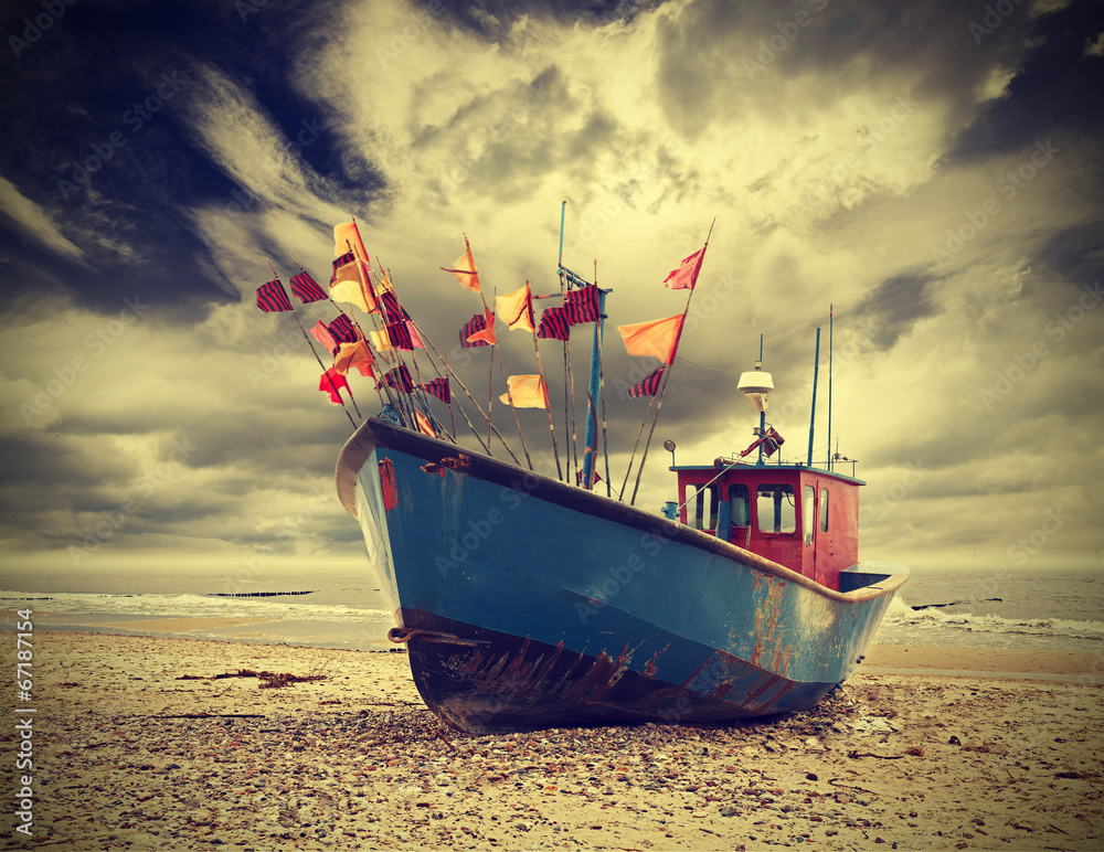 Small fishing boat on shore of the Baltic Sea, vintage toning applied.