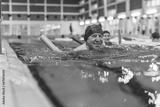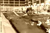 smiling senior Caucasian man with blue swimming cap using a swim noodle in the pool. High quality photo