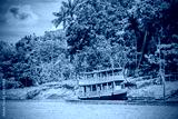 Retro toned picture of a wooden boat on the Amazon river, Brazil.