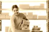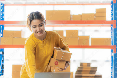 Beautiful Asian startup owner stays happily at home with packages on SME supply chain, purchasing, omnichannel purchasing or online selling ideas at home.