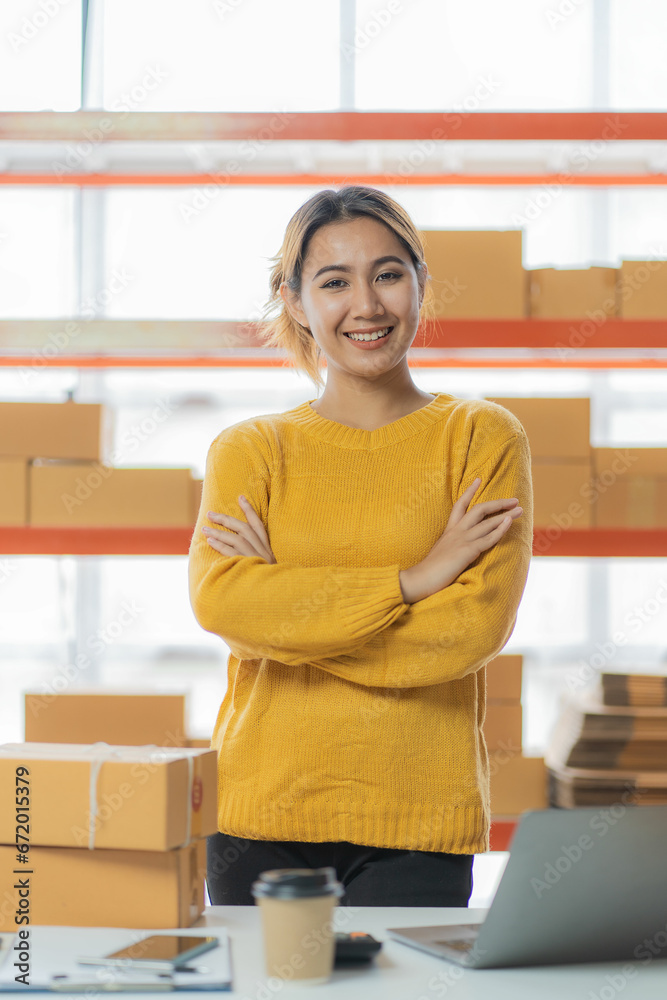Beautiful Asian startup owner stays happily at home with packages on SME supply chain, purchasing, omnichannel purchasing or online selling ideas at home.