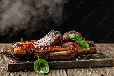 Hot grilled pork ribs with sauce and smoke on a wooden board. Restaurant menu, dieting, cookbook recipe