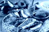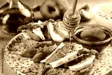 Peach prosciutto bruschetta with mozzarella, basil. Delicious appetizer for wine. Clean eating, dieting, vegan food concept. top view