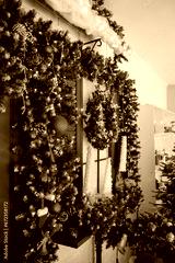 Christmas porch with a wreath on the doors in red and green colors. Decorating the facade of a house for the holiday.