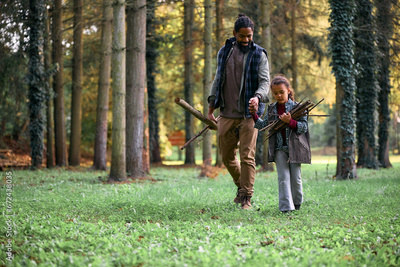 Black little girl and her father collecting tree branchers for campfire while spending day in forest