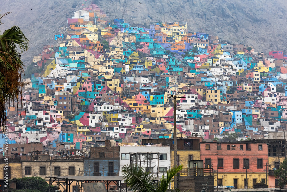 Colorful houses on a hillside in Lima, Peru. Poor district