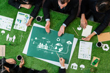 Top view ESG investment project with business leaders in meeting, brainstorm and invest in green project for environmental protection with sustainable net zero and renewable energy technology.Reliance
