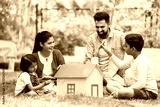 Happy indian parents helping kids to do painting on toy house at park - concept of Family art project, weekend holidays and Parental guidance.