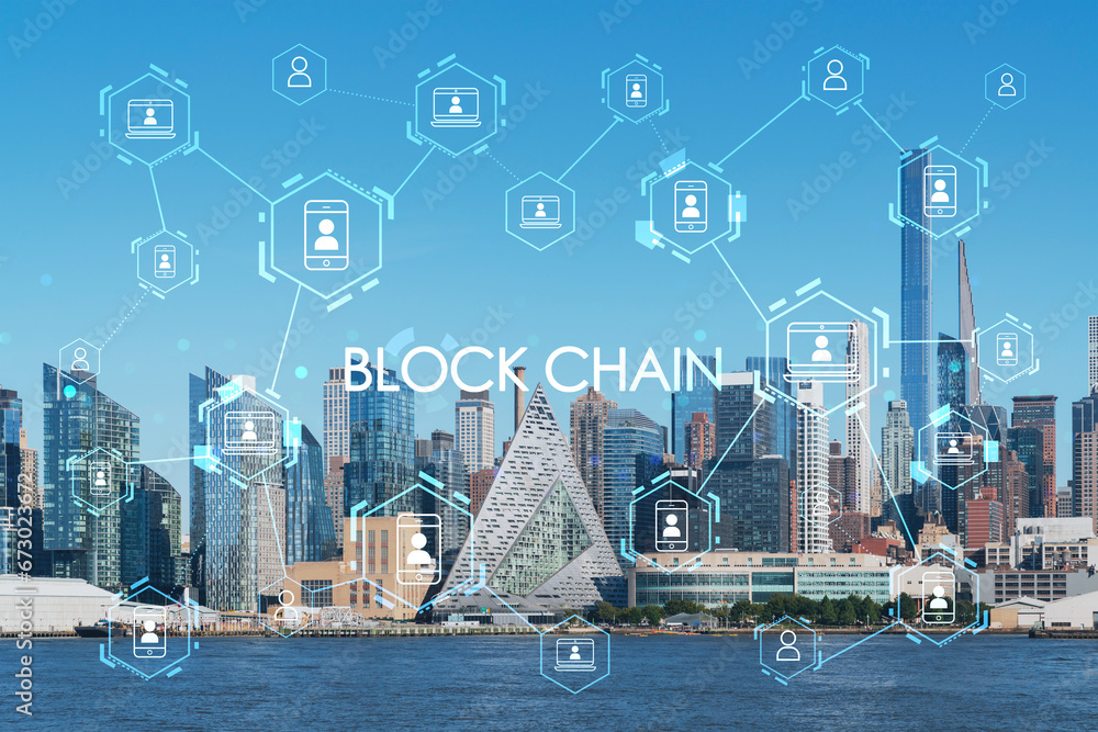 New York City skyline from New Jersey over the Hudson River towards Midtown Manhattan at day time. Decentralized economy. Blockchain, cryptography and cryptocurrency concept, hologram