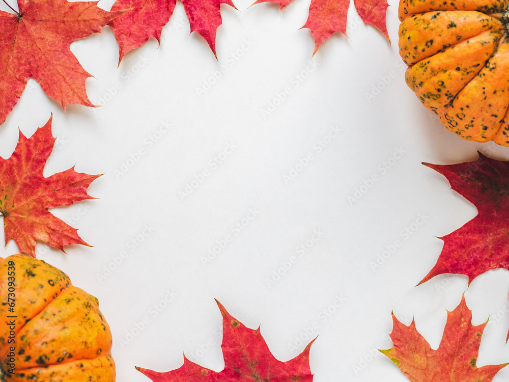 Bright pumpkins, leaves, berries and flowers lie on an empty table. Place for a congratulatory inscription. Close-up, view from above. Congratulations for loved ones, relatives, friends and colleagues