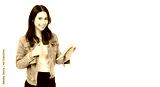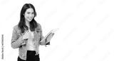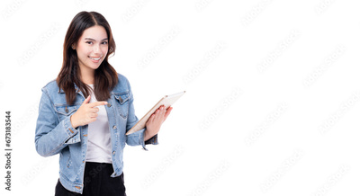 Young teenager woman company worker smiling portrait Young business girl holding digital tablet standing over white background copy space Success happy lady point to digital tablet looking at camera