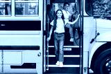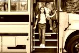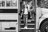 Happy preteen girl getting of the yellow school bus, smiling at camera