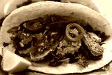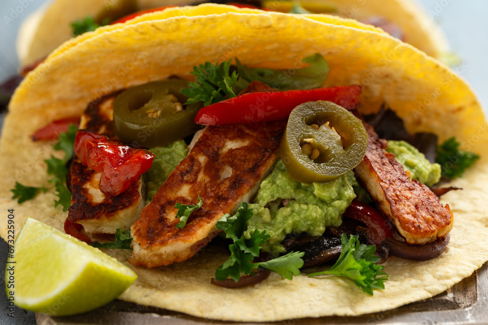 Fried halloumi fajitas with pan roasted onions and bell peppers, avocado guacamole and pickled jalapeno peppers
