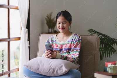 Cheerful asian girl using phone in Christmas event celebrate, Happy Holidays..