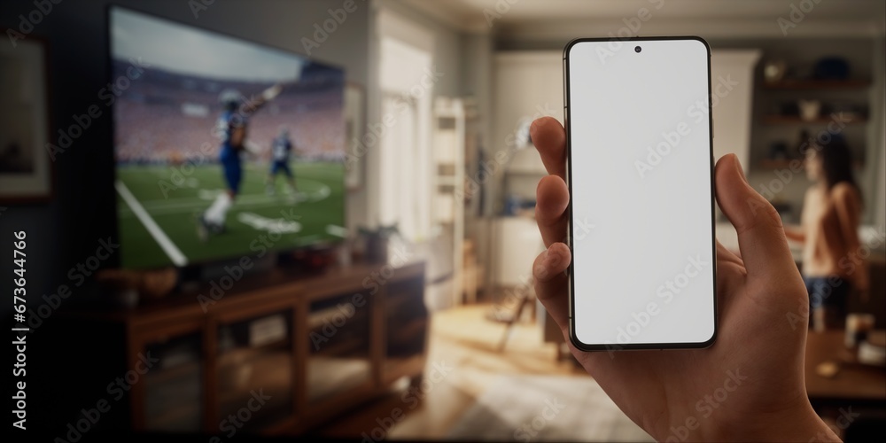Caucasian male watching football at home with friends, making bets on his phone