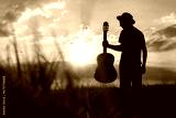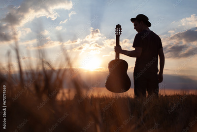 silhouette of man with guitar and hat, summer music festival