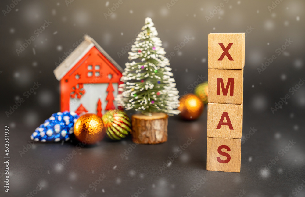 Wooden blocks with the word Xmas, miniature house and a Christmas tree. New Year or Xmas winter holiday. Decoration, celebration. The concept of the beginning of the new year. Snow, snowfall