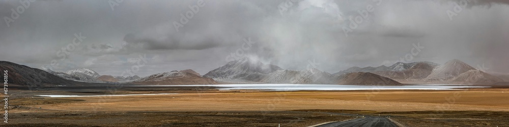 Panoramic view of Ali in Tibet with a landscape of majestic mountains and a serene blue lake