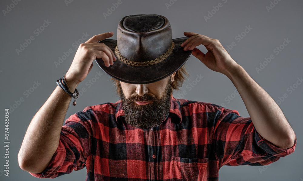 Leather cowboy hat. Portrait man wearing cowboy hat. Cowboys in hat. Handsome bearded macho. Man unshaven cowboys. Handsome hipster with cowboy hat