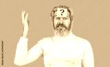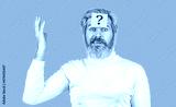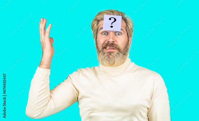 Paper notes with question marks. Beard man question mark in head, solution problems. Thinking man with question mark on blue background. Man with question mark on forehead