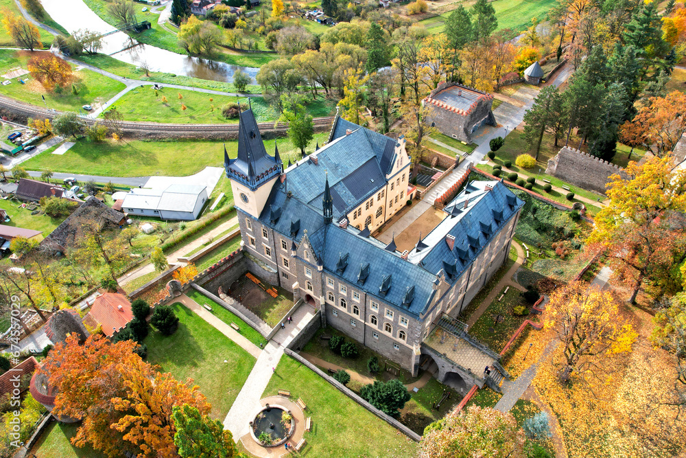 Aerial image of old building in fall autumn in Czech Republic called Zruc nad Sazavou HDR