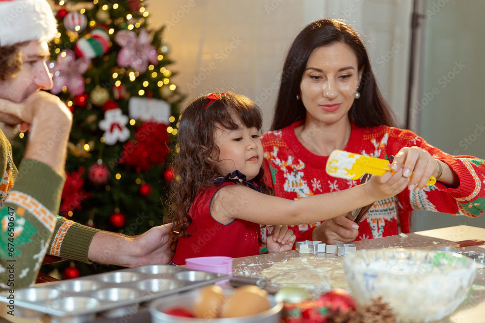 Happy family christmas day. Parents and daughter celebrate Christmas happily in their own home. Little girl enjoying make cookie bakery desserts on food table holiday merry festive activities.