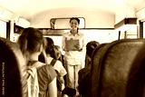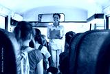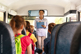 Friendly black female teacher checking off children names sitting inside school bus