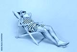 Full length photo of relaxing funky senior man wear red striped lying deck chair hands behind head empty space isolated yellow color background