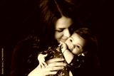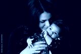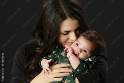 Portrait of young mother holding her little baby girl in green Christmas outfit, winter holiday, family memories, the first Christmas together