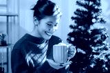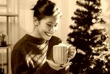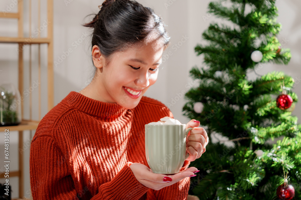Closeup female hands holding cup of hot cocoa with marshmallow topping.