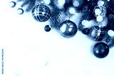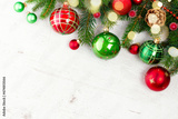 Evergreen fir tree twigs with red and green decorations, flat lay scene on white wooden background