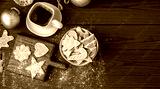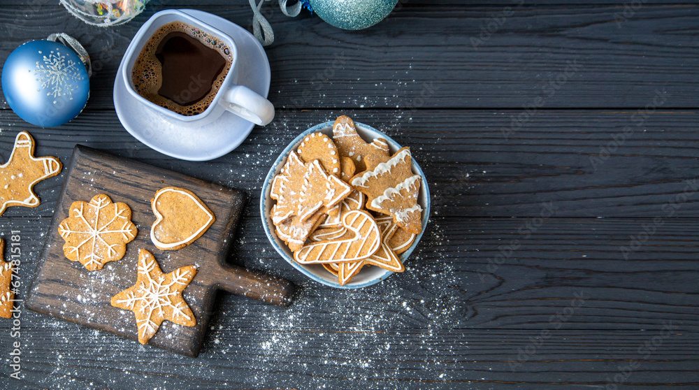 Traditional homemade gingerbread cookies and a cup of coffee. Top view on a dark wooden table with copy space. Christmas decor, holiday mood.
