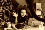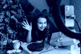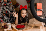 little girl blogger leads the broadcast and cooks a pie at home for Christmas