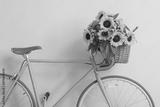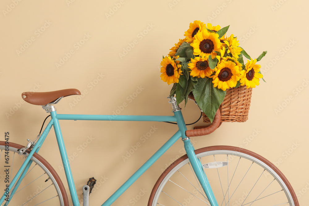 Bicycle with bouquet of beautiful sunflowers in wicker basket near beige wall