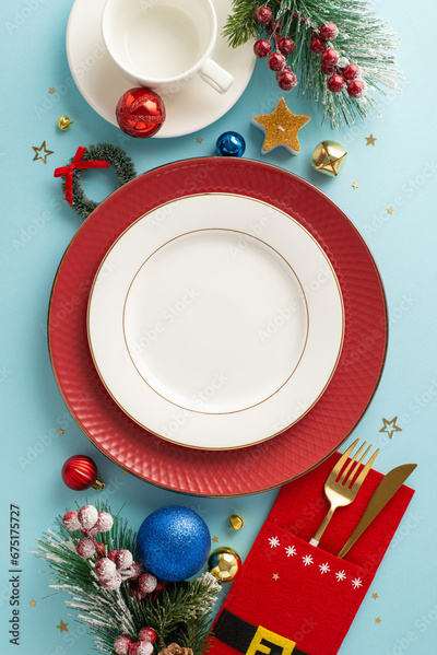 Joyful Christmas table arrangement: vertical top-down view featuring plates, whimsical cutlery holder, mug, balls, confetti, frosted fir, holly berries on pastel blue— space for text or advertisement