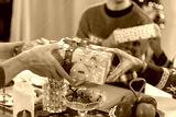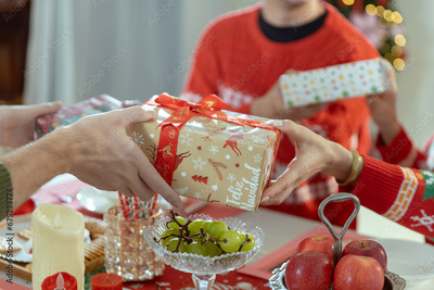 Friends young male female surprise fun greeting celebration enjoy happy giving gifts boxes and dinner on Christmas Day. Merry Christmas and Happy Holiday.