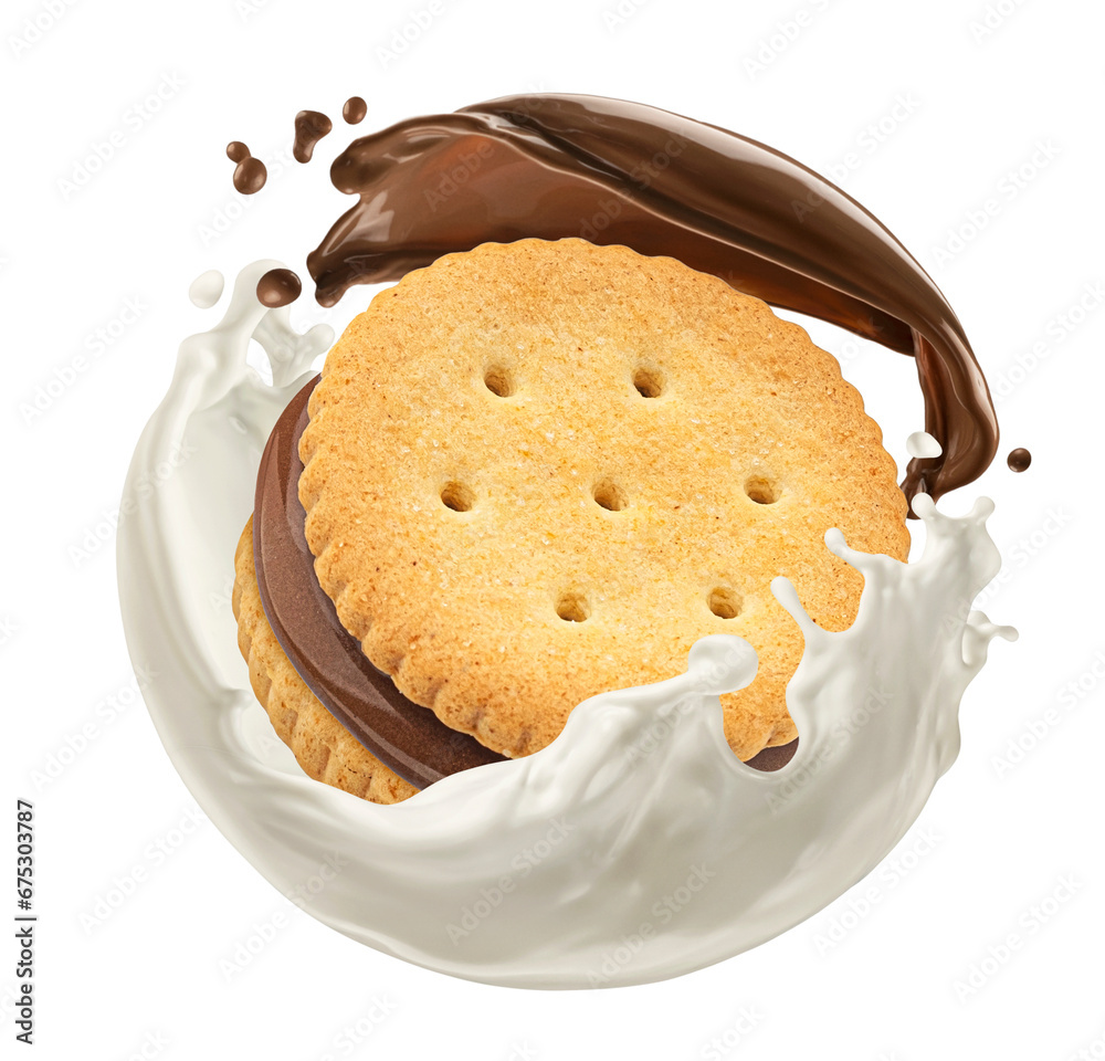 Chocolate sandwich cookie falling with milk splash isolated on white background