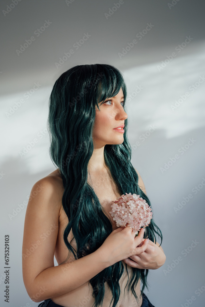 Side view Adorable tender young girl with long turquoise color curly hair with pink hydrangea flower on the light background. Magic look. Concept of beauty, art, fashion. Mermaid style. Vertical card