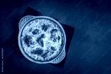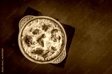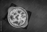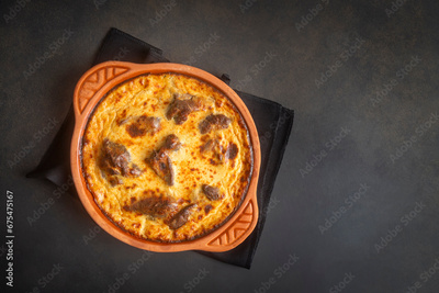 Tave kosi is a national Albanian dish of baked lamb and rice with yoghurt close-up in a pan on the table. horizontal top view from above. Turkish name; Elbasan tava